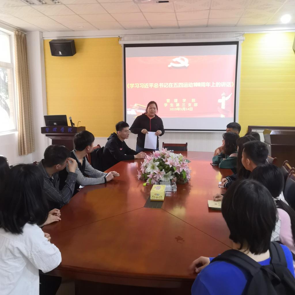 本次支部大会于2019年5月15日13:00在新校区主教学楼F栋104教室召开。由支部书记单艳艳同志担任会议主持。在会议中,单艳艳同志带领员工第三支部全体成员学习相关材料,内容包括:新时代中国青年运动主题,新时代中国青年运动的方向,新时代中国青年的使命。