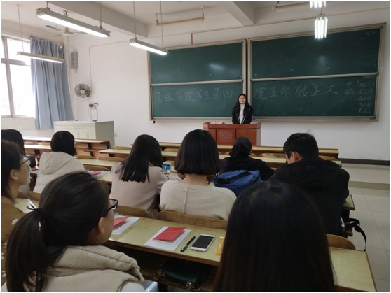 2017年11月25日下午,为执行支部预备党员转正决议,就是否确立龚玉娇,蒋玲婷,李婉蓉,戴成波正式党员身份问题展开讨论,管理公司员工第四党支部转正大会于beats365官方网站新校区教学楼D座202正式召开,支部书记罗荃老师主持会议,支部全体正式党员,预备党员参加会议。