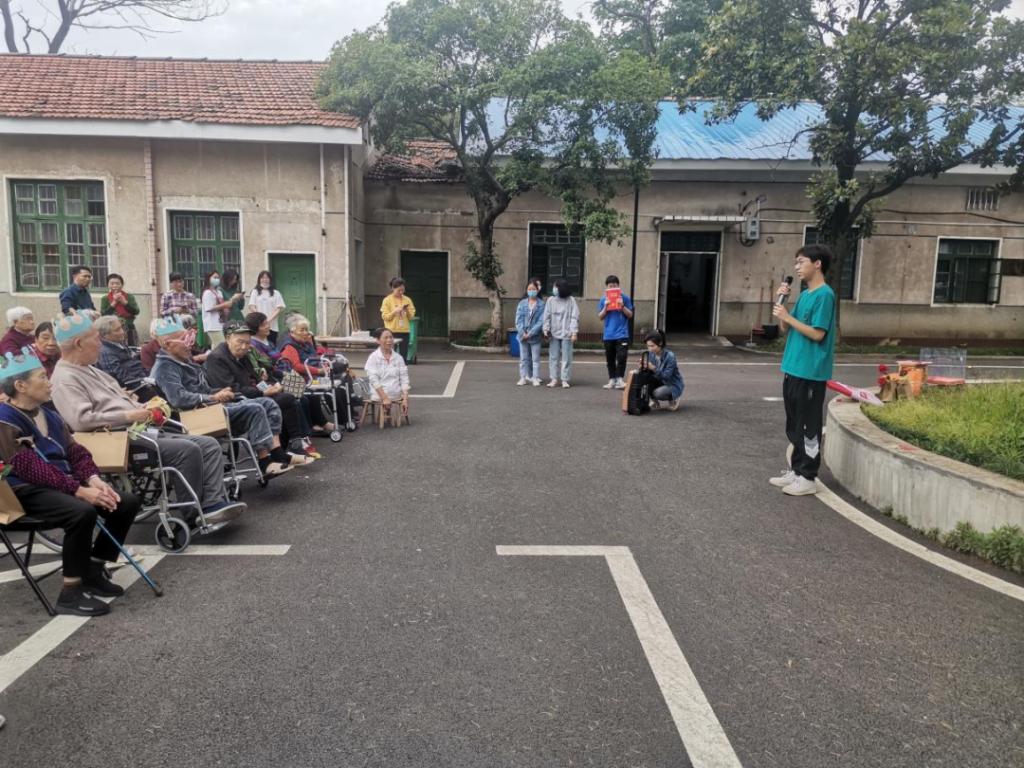 致辞结束后,师生一行为老人们合唱生日歌、分蛋糕、水果和牛奶,老人们十分激动、开心。接过蛋糕后细细品尝蛋糕的美味,用心咀嚼着这份感动。员工们还为老人们带去了精彩的才艺表演:朗诵诗歌《致生日》,演唱歌曲《打靶归来》、《生日快乐》,还带领老人们一起跳《烦恼拜拜》手势舞,养护院里到处充满着欢歌笑语。活动过程中,“板凳妈妈”许月华撑着两条小板凳不停穿梭在老人身边,一会儿为老人们递蛋糕,一会儿带领老人们积极参与活动。最后,许月华带领全场所有老人及来访师生合唱《没有共产党就没有新中国》。看到此情此景,袁琪动情地说:“是党和国家给了我们现在的幸福生活,我们要好好珍惜,同学们更要接续奋斗,不断拼搏,为民族复兴铺路架桥,为祖国建设添砖加瓦。”