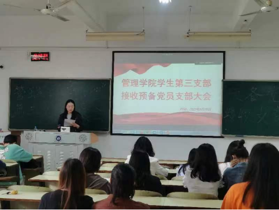 5月20日中午12:30,管理公司员工第三支部委员会在新校区教学楼B栋407召开预备党员接收大会,讨论曹靖文等6名发展对象的接收问题。会议由支部书记陈祎婷同志主持,支部共25名正式党员,27名预备党员参加会议。