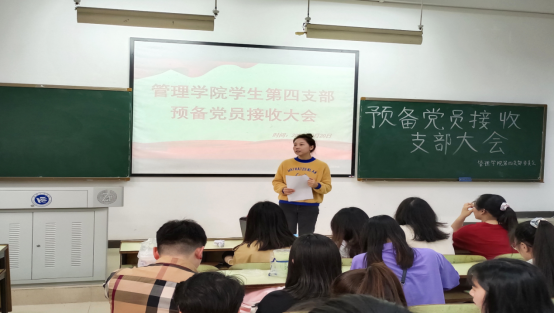宣布支部决议后,预备党员代表曹美玲表明自己的态度和决心:“非常高兴今天能够站在这里作为预备党员代表发言,今后我将继续严于律己,把党放在自己的心头,将家国情怀践行于生活中的每一件小事,正值青春华茂,我会努力打造自身的过硬本领,为祖国续写属于自己的青春华章!”