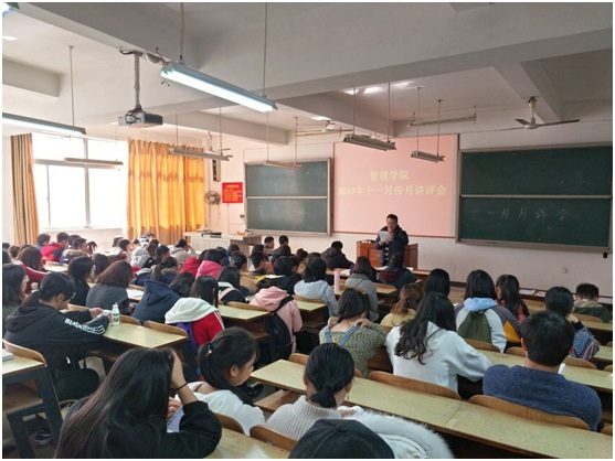2017年11月23日中午12:10,管理公司大一大二单学号同学,大三班委,大四班长、学委、团支书,在主校区教室内进行本学期第三次月评会议。学办辅导老师罗荃、黎博、单艳艳、包海燕、周艺、宋志航对工商管理、旅游管理、人力资源管理、会计学、物流管理、市场营销六个专业进行讲评,本月心理会议也同月评会同一时间顺利展开。