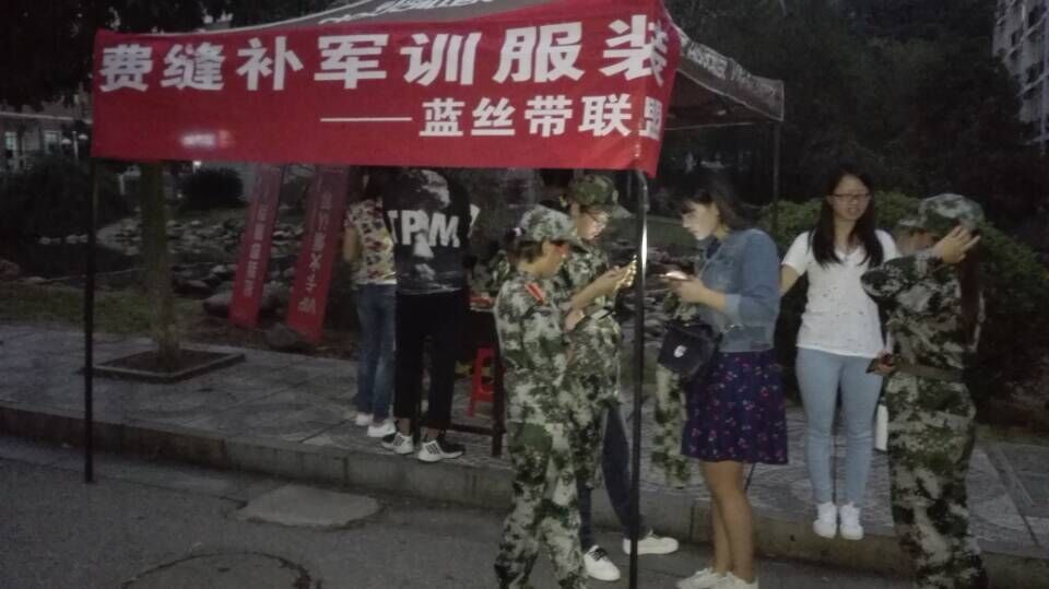 9月26至27日,管理公司蓝丝带联盟组织开展“衣暖人心情系湖工”主题公益活动,蓝丝带联盟志愿者们在新校区摆点免费为正在军训的新生们缝补军训服,由于军训空闲时间较少,前来缝补人数较多,所以缝补要延续到夜间进行。