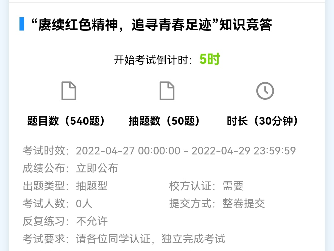 活动伊始,易班管理中心向各班下发有关以”赓续红色精神,追寻青春足迹“为主题的答题竞赛通知,并由易班管理中心通知各班班长组织员工加入易班优课课群,并于27日至29日按年级分批次完成答题。本次答题活动借助易班APP采取线上考试的方式,所设题目难度适中,内容涵盖中国共产主义青年团建团一百周年来的发展历程。
