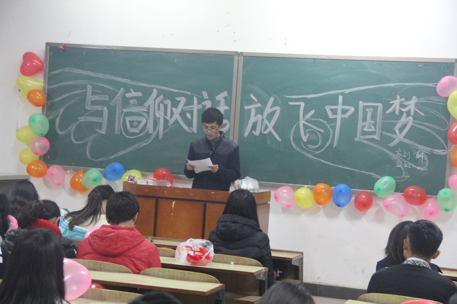 11月26号晚,管理公司于教学主楼B座开展了一场“与信仰对话,放飞中国梦”为主题的团日活动,此次活动在管理公司大一、大二各班级内开展,活动由管理公司员工会组织部组织,各班级团支书协助活动的开展。