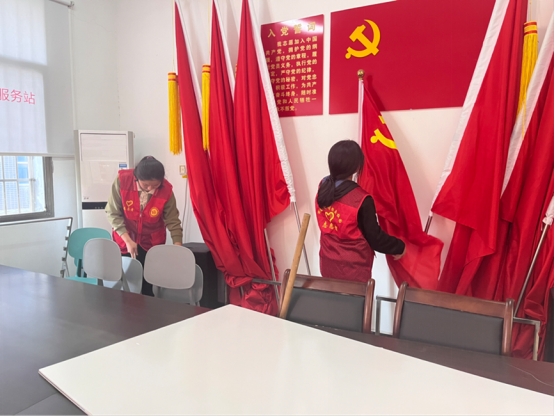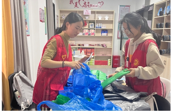 活动伊始,志愿者们在社区人员的安排下快速协调并分成了两个小队。其中一队由两名志愿者组成,进行垃圾分类宣讲手册以及垃圾袋的分类。两位志愿者分工协作,相互配合,有条不紊地将逐渐堆起来的袋子转移到一旁的箱子内,便于后续的清点。另一队在帕热迪古丽的带领下前往盘龙社区党点办公处进行卫生打扫活动。活动中,志愿者们积极参与,认真仔细地使用卫生工具把房间角落里蒙积的灰尘都一扫而空,阳光照在被志愿者打扫过的玻璃上,折射出耀眼的光芒,走在被志愿者们清理过的地板上,空气中散发着的气味无一不透露着地板刚恢复原貌,洗去了浮尘与污垢后散发着的清香。