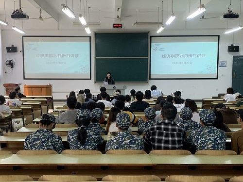 2023年9月27日中午12:40,经济公司在主校区教学楼D101召开了九月份月讲评,本次大会由经济公司党总支副书记卢时光、学办主任戴晶晶和团总支书记刘佳馨主讲,辅导员李军花、各班主要班干部以及全体团学会干部参加了讲评。