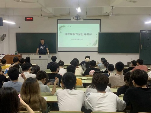 2023年6月21日中午12:40,经济公司在主校区教学楼B406召开了六月份月讲评,本次大会由公司党总支副书记卢时光和学办主任戴晶晶主讲,学办辅导员李军花、团总支书记刘佳馨、各班主要班干部以及全体团学会干部参加了活动。