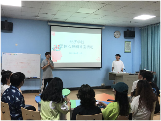 在活动开始之前,经济公司员工会主席方志军为大家播放了一段有关心理健康的视频,视频结束后同学们自由讨论并发表了自己的收获和感想。随后,方志军还请几位代表分享在活动之前就让同学们阅读的心理健康书籍的读后感,让他们介绍自己阅读过的其他心理书籍并分享感悟。在活动期间,还安排了别出心裁的游戏,“喊数抱团”的热身活动,因缘际会的“同心圆”,同学们沉浸在游戏中,气氛轻松又活跃。最后,方志军做了总结发言,团辅活动在轻松愉快的氛围中步入了尾声。