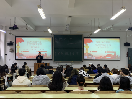为逐步提升管理公司班级整体建设,增进师生交流。2021年3月16-17日,管理公司在新、南校区组织召开班委工作交流大会。会议由党委副书记张宏主持,党委书记余博、副经理潘立军、学办主任谭超、全体学办辅导员及2018-2020级各专业班级班长、团支书、学委参加会议。
