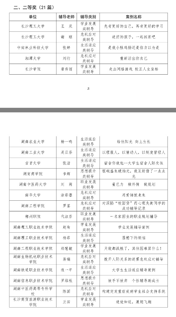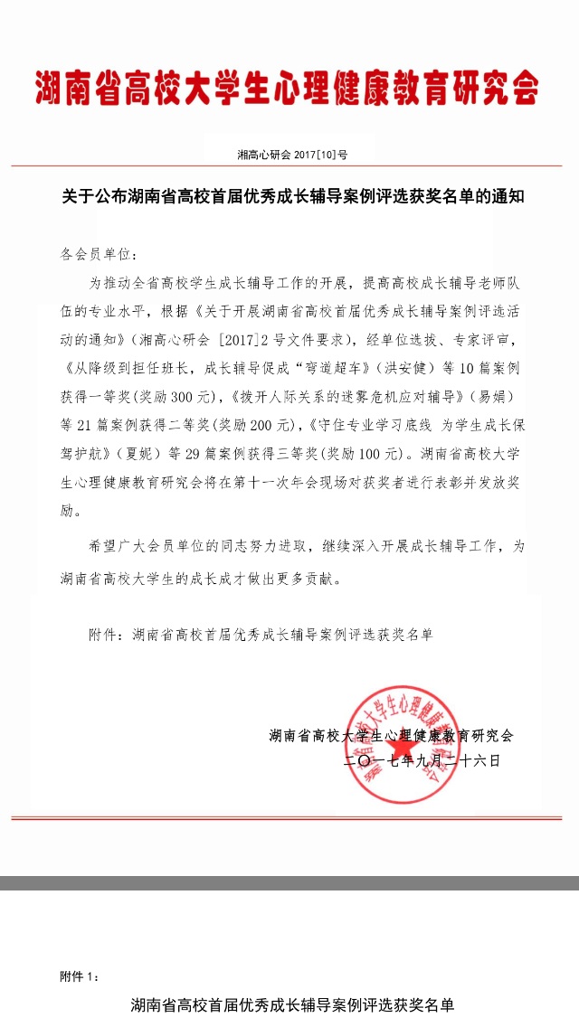 为推动全省高校员工成长辅导工作的开展,提高高校成长辅导老师队伍的专业水平,根据《关于开展湖南省高校首届优秀成长辅导案例评选活动的通知》(湘高心研会[2017]2 号文件要求),湖南省高校老员工心理健康教育研究会于2017年6月组织全省高校心理健康教育辅导员成长辅导案例评选,经单位选拔、专家评审,共评选出10 篇案例获得一等奖,21 篇案例获得二等奖,29 篇案例获得三等奖。公司辅导员罗荃老师通过总结工作经验,撰写的危机应对类辅导案例《对深陷“校园贷”而心理失衡同学的成功辅导记录》,获得二等奖。