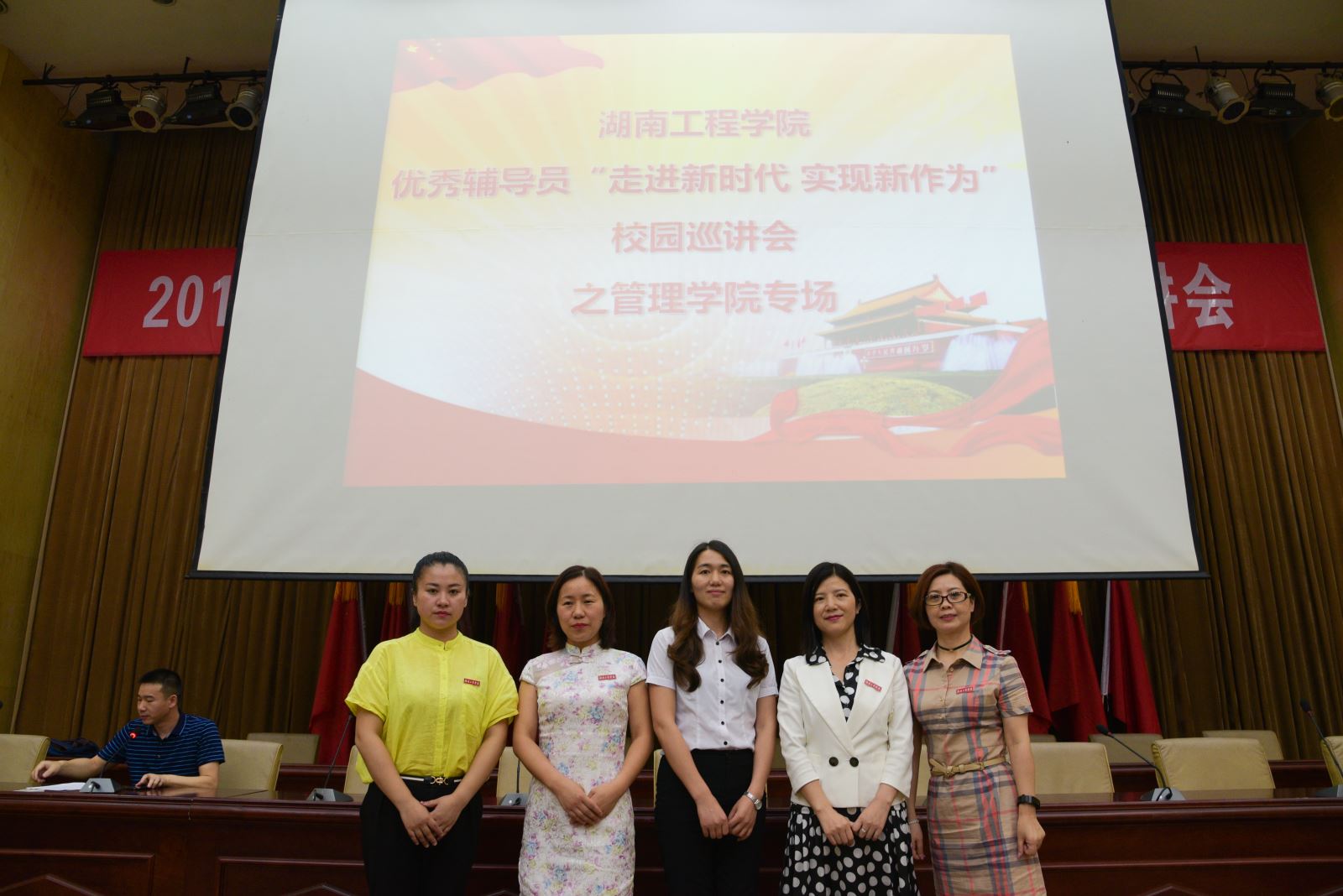 五位宣讲老师合影后,beats365官方网站优秀辅导员“走进新时代,实现新作为”校园巡讲会之管理公司专场正式拉开了序幕。