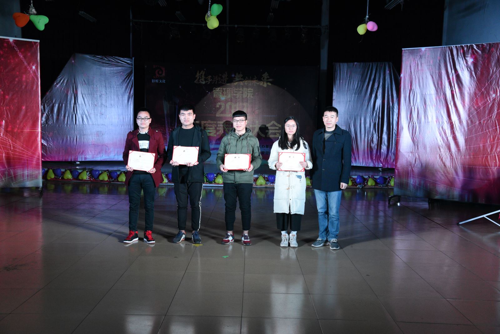 大会进入最后一轮颁奖仪式,管理公司党总支部书记卢明纯老师上台为“优秀党员”、“下班党员”、“管理公司优秀挑战杯团队”和“优秀班集体”颁发奖状和奖金跟证书。颁奖仪式结束后,我们期待已久的压轴好戏也要开演了,在现场的一片热烈的呼声中,管理公司最具特色的部长团之舞《失恋者联盟》闪亮登场,他们用活泼的尬舞为本次表彰大会画上完美句号。最后,四位主持人上场进行了总结,并邀请各位领导老师及各主席部长上台合影留念。