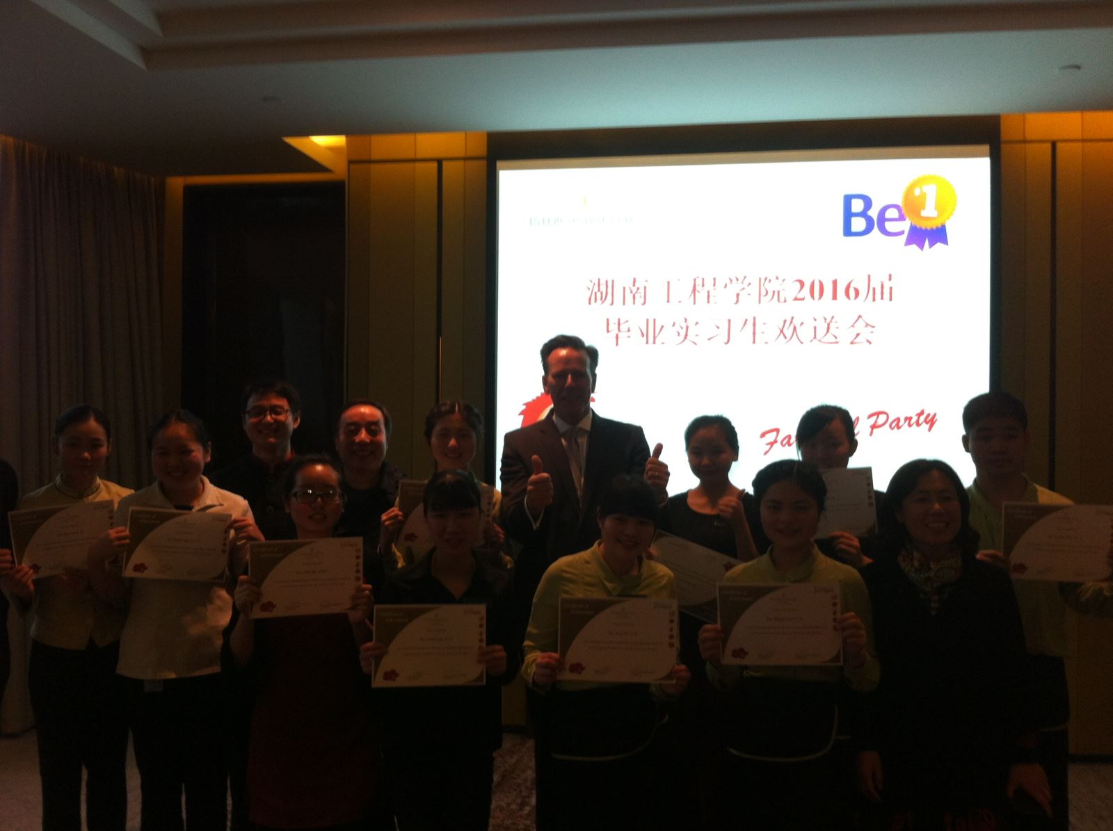蒲克南总经理对公司旅游管理专业员工在实习期间的表现给予了高度评价,认为公司旅游管理专业员工素质全面,具有扎实的专业基础知识和吃苦耐劳的精神,圆满完成了专业实习任务,并诚邀同学们加盟长沙北辰洲际酒店。蒲克南总经理与吴振顺经理还一起为同学们颁发了实习证书。