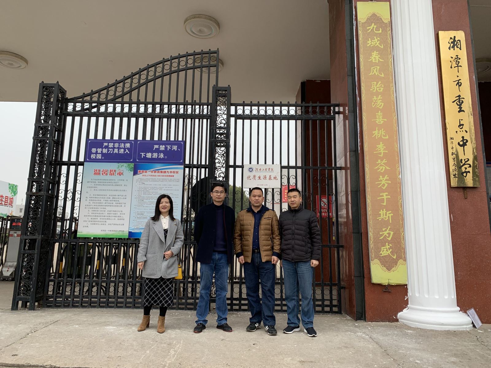 12月5日上午,管理公司受招生与就业指导处委托,前往公司友好联系高中湘潭县一中教育集团之一的湘潭县第九中学举行“优质生源基地”挂牌仪式。管理公司党总支副书记钱祖煜领队,学办主任罗荃老师和辅导员黎博老师随行。湘潭县第九中学总务处主任邓明辉和教务处主任易亚军代表校方接收授牌。