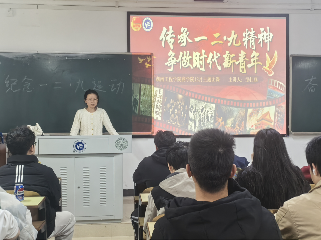 为传承爱国主义精神,激励青年学子勇担时代使命,beats365于2025年12月17日下午在主教学楼A202教室举办了“传承一二·九精神,争做时代新青年”主题团课,beats365团委书记邹牡燕老师为本次团课主讲人,国际经济与贸易2301、2302班全体员工共同参与。
