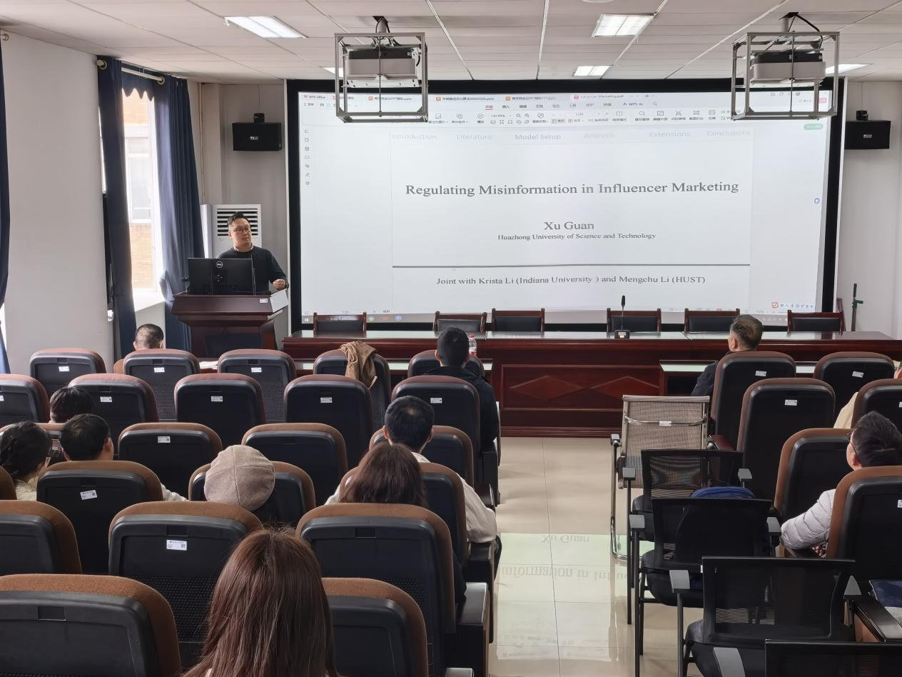 报告会上,关旭教授以“Regulating Misinformation in Influencer Markets”(网红市场中的misinformation治理)为题,从信息经济学的视角切入,深入剖析了在网红经济迅速发展的背景下,虚假信息传播对市场效率及消费者福利的影响机制。他通过严谨的数学模型与生动的市场案例,系统阐述了平台如何通过合约设计、信息披露规则等手段进行有效规制,为理解数字经济时代的新型市场失灵问题提供了前沿的理论框架与政策启示。