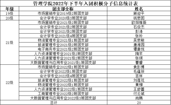 据校团委相关文件及通知精神,参照《中国共产主义青年团发展团员工作细则》,经个人申报,班级团支部推荐,公司团总支评审,拟发展常诗雨、彭凯佳、陈彦名等20名同学为入团积极分子。具体名单公示如下。