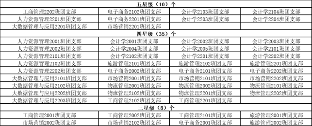 根据beats365官方网站校团委《“对标定级”工作指引》,经各班级团支部自评、公司团总支复核,评定工商管理2202班等10个团支部为五星级团支部,人力资源管理2001班等35个团支部为四星级团支部,工商管理2001班等8个团支部为三星团支部。现予以公示,具体结果如下: