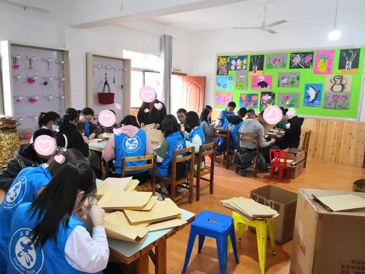 孩子在折纸袋时非常认真,老师和志愿者们也经常夸他们,对于老师和志愿者们的夸奖,孩子们一下子就特别开心,红红的脸如今天的朝阳,充满了希望,孩子们乐了一会后便又开始自己手头上未完成的任务,老师在他们的汗水和笑脸中看到了他们的梦想,他们的希望。