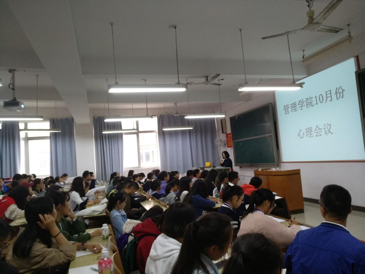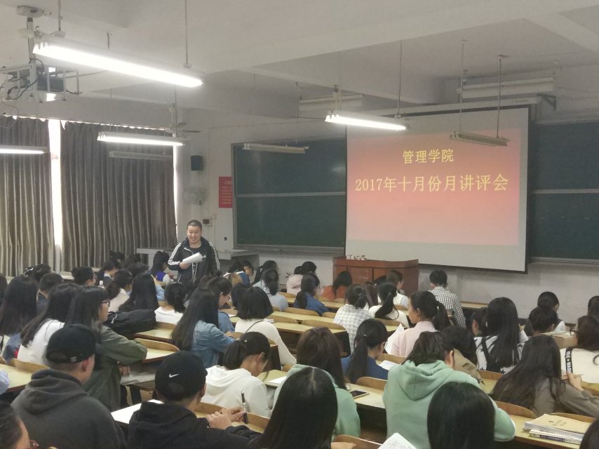 2017年10月25中午12:10,管理公司大二到大四工管、会计、旅管、物流、人力、市营全体双学号同学及大一全体同学在主校区教室内进行本学期第二次月评会议。学办辅导老师黎博、单艳艳、包海燕、宋志航对工管、旅管、人力、会计、物流、市营的六个专业进行讲评,本月心理会议也与月评会同一时间顺利展开,由罗荃老师主持,全体心理委员和寝室长参加了心理会议。