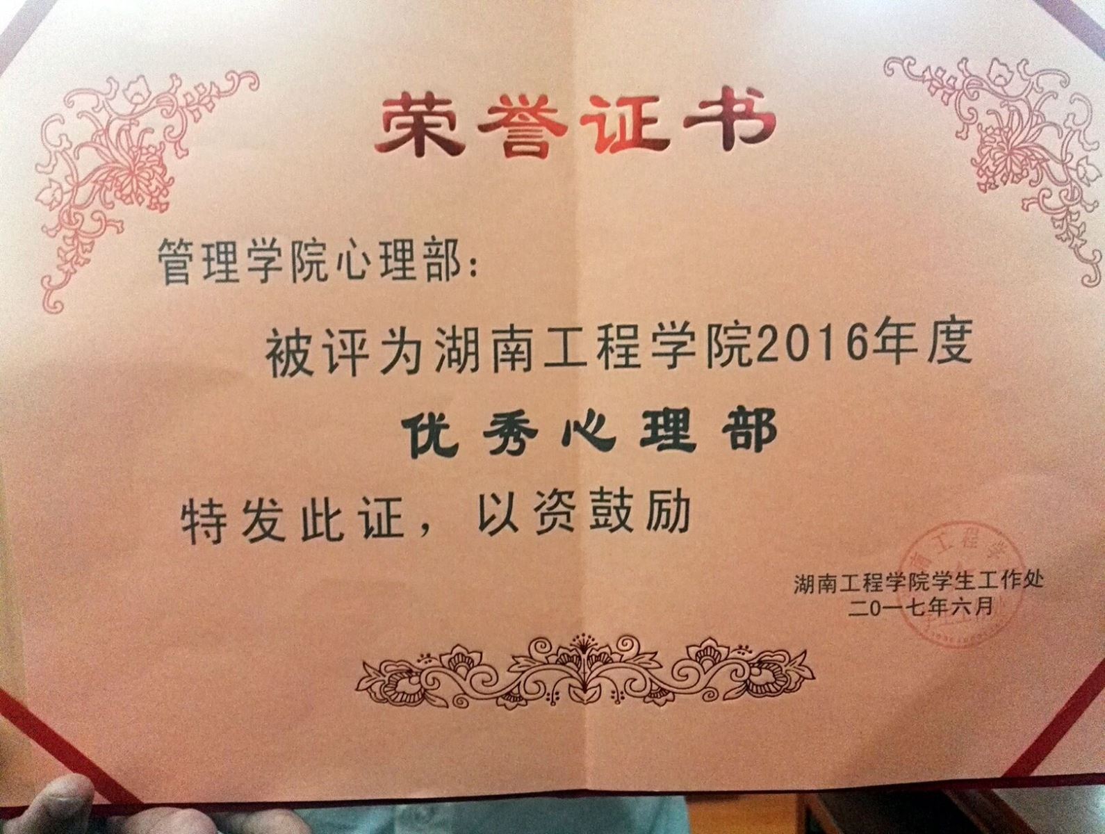 管理公司心理部由于工作有特色,获评“2016年度优秀心理部”。