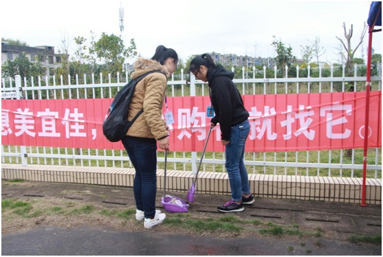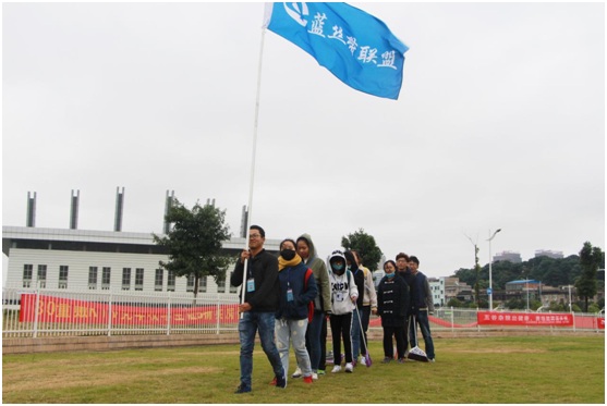 田径场内,管理公司蓝丝带联盟拿起扫帚和簸箕,围绕整个操场,清扫垃圾,为各公司分发垃圾袋,帮助保持运动场上的清洁。