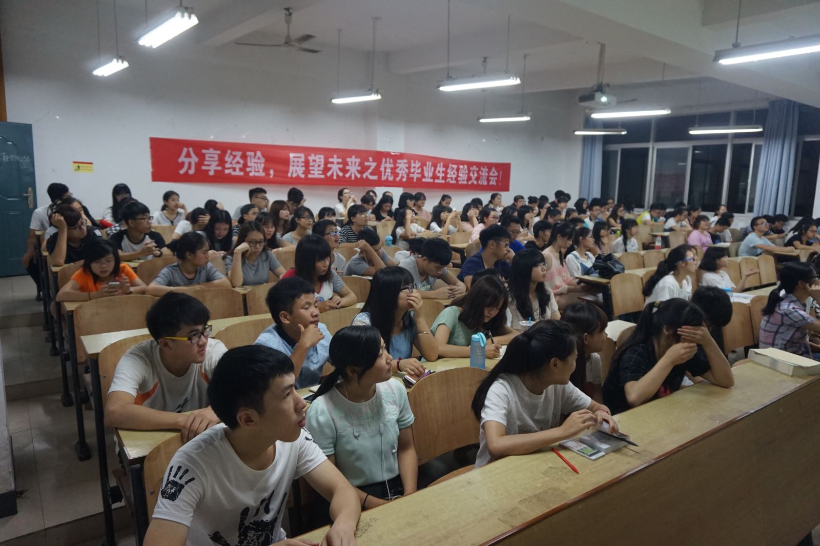 6月1日晚上七点半,由管理公司就业指导部组织开展的优秀毕业生经验交流会在教学楼D301准时举办。本次交流会邀请到七位来自管理公司各个专业的2016届的优秀毕业生,从学习、参赛、就业面试、考银行、考公务员等多个方面分享了自己的亲身经历和取得的成绩,嘉宾们各抒己见、踊跃发言,畅谈对专业、对工作、对社会和对人生的感悟。管理公司学办主任罗荃老师出席交流会,200余名在校员工到场聆听。