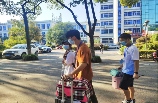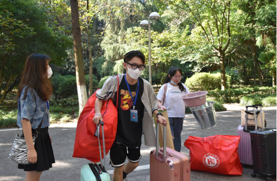 门口的工作者在岗位上尽职尽责,新来的同学也积极配合相关工作。由于疫情的原因,陪同的家长不能进入公司,望着自己满是行李的孩子在志愿者的帮助下进行报道,他们也多了一份安心。坚守在工作棚下的员工工作者们,耐心的回答新生的问题,即便工作非常忙碌,也尽心地引导他们完成报道工作。身负杂重行李的新生,在志愿者的帮助下,减少的不仅仅是身体上的负担,更是减少了第一次一个人进入大学的茫然与无措,感受到了管理公司大家庭的温暖。