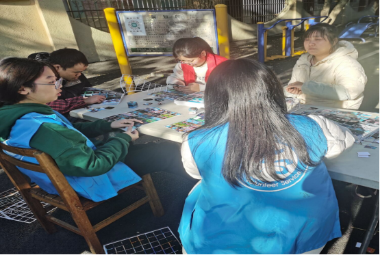 志愿者们一边拼图画卡片一边跟小伙伴们一起交流,小伙伴们给志愿者们讲述了他们在这里的快乐生活,而志愿者们也积极地跟小伙伴们分享他们在大学期间的学习和生活经历。一个看似简单的折图画卡牌活动不仅能给小伙伴们带来极大的快乐,而且能拉近志愿者们跟小伙伴们的距离。