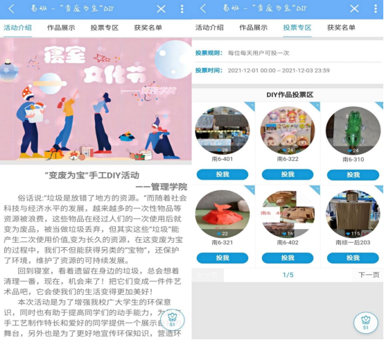 活动初始,生活纪检部下发相关活动事项至各班,由各班生活委员组织本班各寝室参加手工DIY活动,于11月23日收集作品材料交至生活纪检部,经过相关负责部门的初选,管理公司全体同学可于12月1日至3日在易班平台上对评选出的30个作品进行投票,最终经过激励而精彩的角逐,本次活动获奖情况如下: