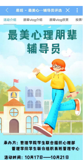 活动首先由各朋辈记录下军训生活的点点滴滴,并将其制作成Vlog视频,对新生的军训生活进行总结。然后,心理部收集各朋辈的视频,由易班管理中心进行仔细的视频审核工作,并搭建好作品展示平台并将其呈现在易班app上。管理公司全体员工于10月17日开始对自己心仪的朋辈辅导员进行投票。此次活动公司同学积极参与,最后根据得票情况选出特等奖两名,一等奖三名,二等奖四名,三等奖五名,优胜奖五名,获奖名单附下。
