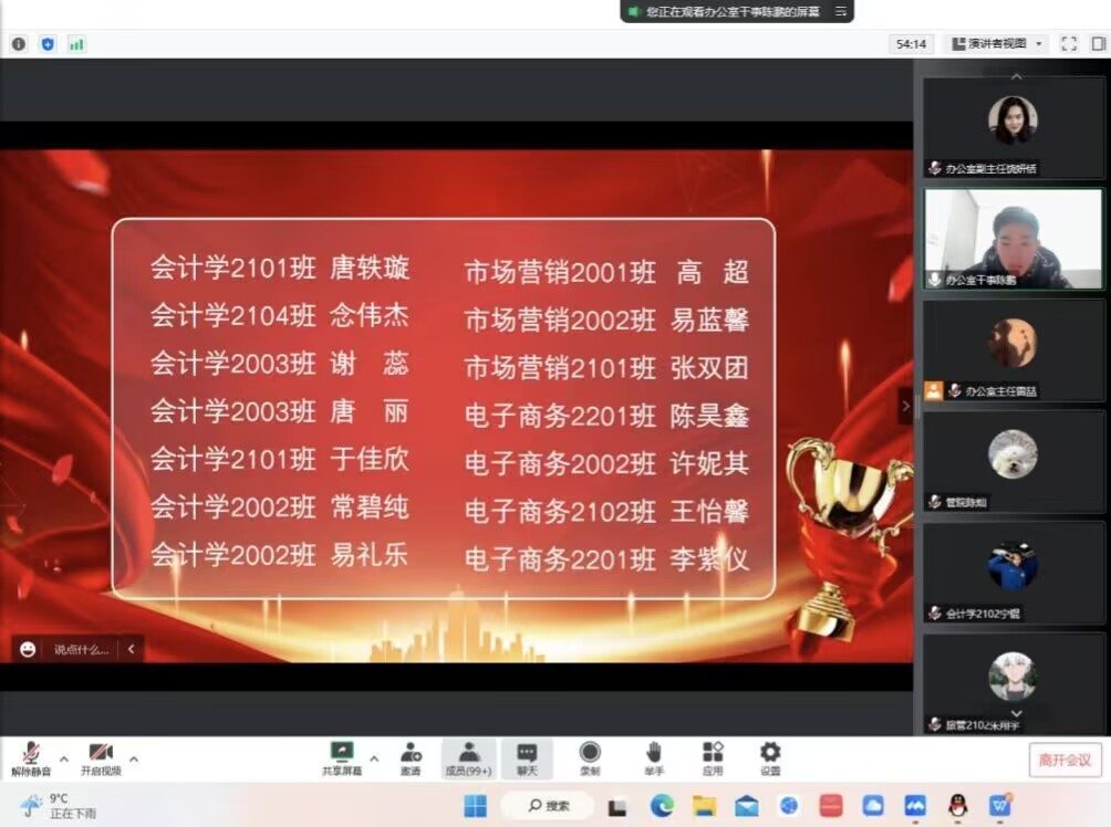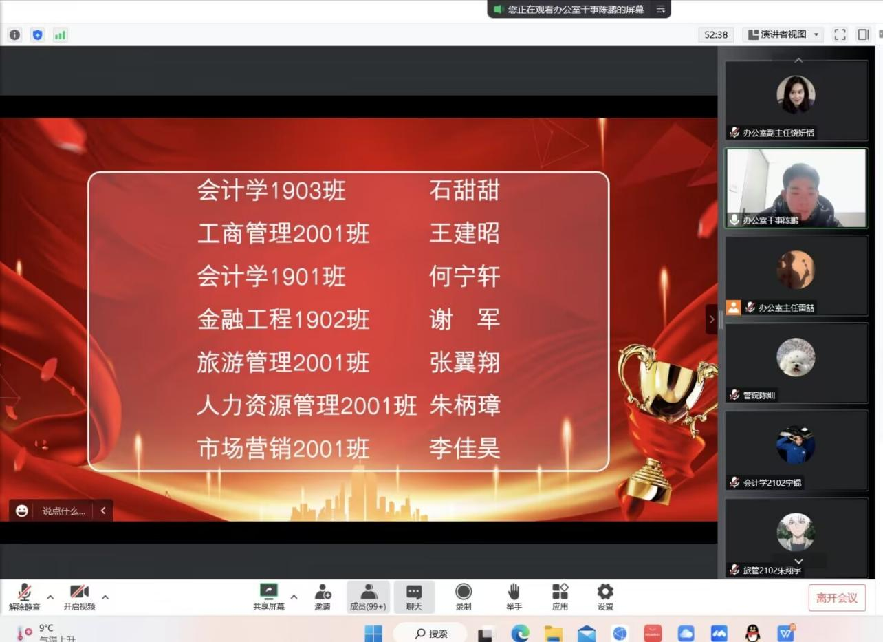 寒来暑往,岁月更迭,转眼间管理公司又经历了难忘的一年,为表彰优秀,鼓励先进,树立典型,总结管理公司班集体、团队和员工过去一年的表现突出,推动新一年工作高质量发展,进一步凝聚广大师生员工的智慧和力量,于12月20日下午14:00举行2022年表彰大会。会议通过腾讯会议形式展开,邀请到六位员工代表发言,吸引了百余名观众前来观看