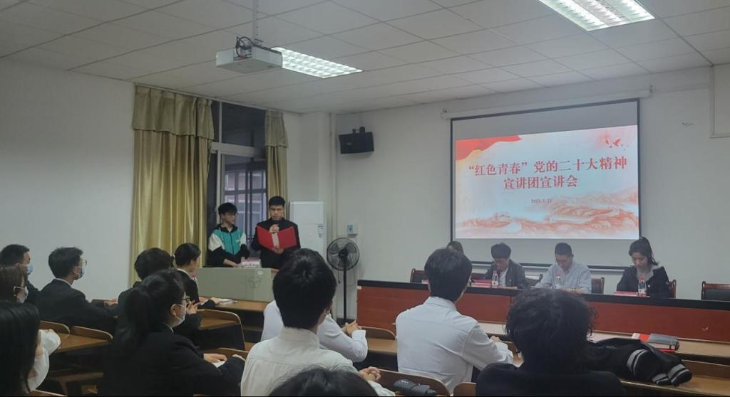 为深刻阐述党的二十大思想内涵、核心要义和实践要求,引导广大青年用党的最新理论知识武装头脑,在深入学习中践行报国使命,奏响时代强音,彰显青春担当,5月11日晚,“红色青春”党的二十大精神宣讲团于管理公司开展专题宣讲。本次宣讲由校团委主办,管理公司团总支承办。校团委书记刘琤,管理公司党委副书记谭超出席,校团委相关负责人、管理公司教师代表及40余名优秀团员青年代表参加宣讲会。