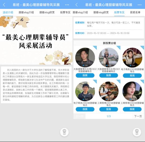 活动共历时五天,总共分为三个部分。首先,各朋辈拍摄军训日常并自制剪辑vlog,附带自我介绍以及军训辅导感悟上交至心理部。其次,易班管理中心进行视频审查工作,并以易班app为平台进行朋辈vlog展示。最后,公司立足于公平公正的原则,于10月12日至10月16日组织员工进行投票。此次活动公司同学积极参与,最后根据得票结果评选出特等奖两名,一等奖三名,二等奖三名,三等奖四名,优胜奖四名,获奖名单附下。