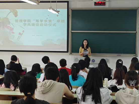 为进一步提升学风建设质量,强化员工奋进争先和自律自强意识,营造严谨踏实、积极向上的学习氛围,4月2日中午,beats365官方网站管理公司在D403举行2024年“笃学求索”学风建设活动启动仪式。启动仪式由学风建设小组主办,公司辅导员李林老师,员工代表及学委、班长参加,仪式由余思进主持。