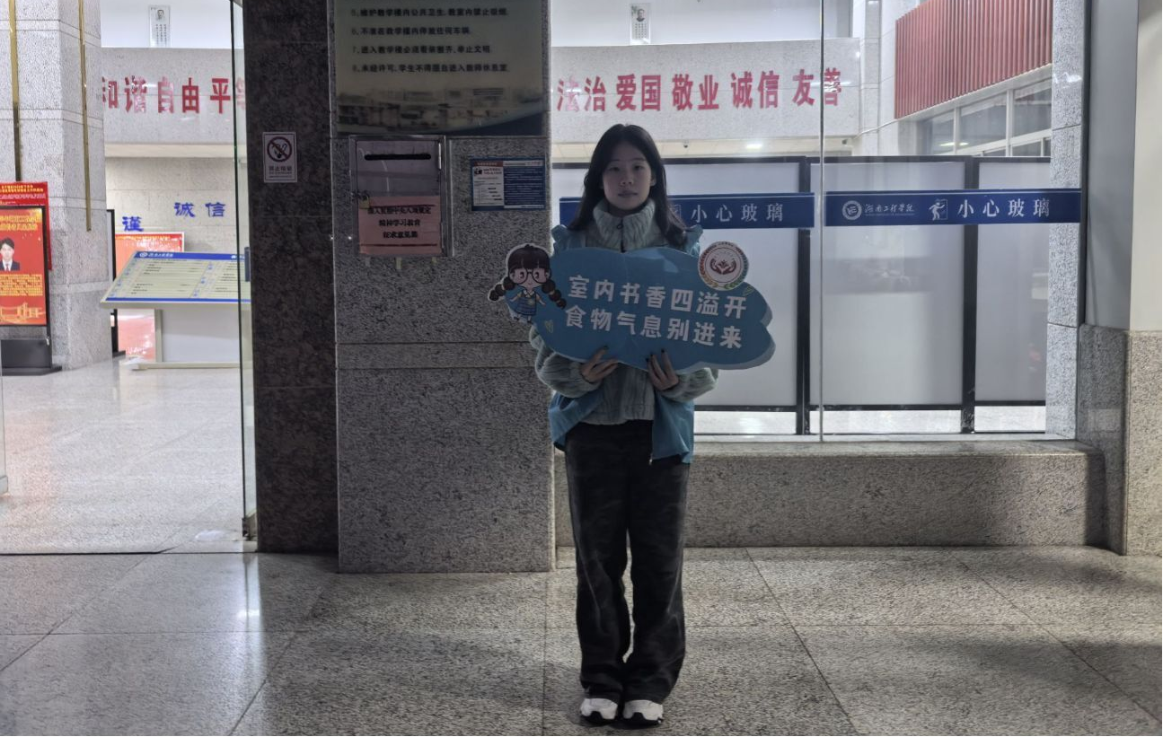 值守期间,志愿者们手持印有“室内书香四意开,食物气息别进来”的宣传牌,坚守岗位、认真履职:耐心劝导携带餐食进入教学区的同学,引导其至指定就餐区域;温馨提醒衣着不规范(如穿拖鞋、背心等)的同学注意形象,展现学子积极风貌;及时劝阻在教学区域吸烟的行为,宣讲吸烟危害与校园相关规章,共同维护健康清朗的学习环境。